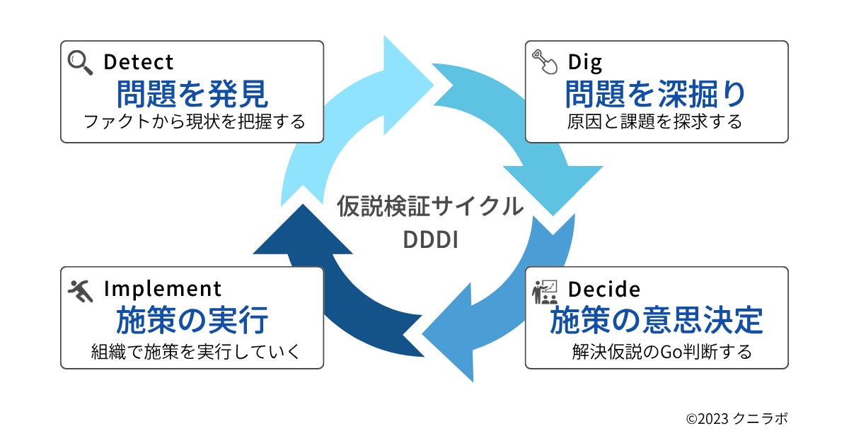 組織やビジネスにおける仮説検証では、以下のようなフェーズを繰り返していきます。クニラボでは、このサイクルをピープルアナリティクスのDDDIサイクルと呼んでいます。