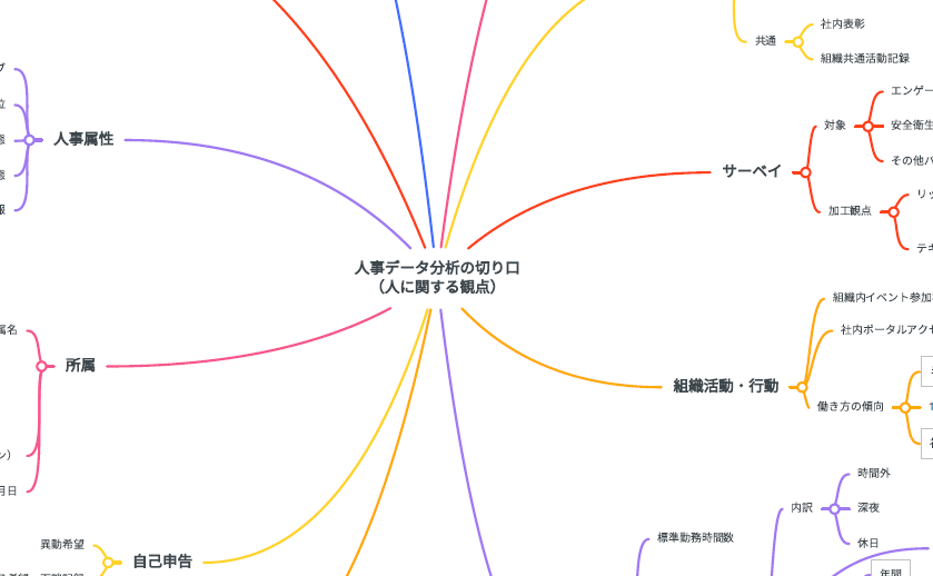 こちらのページでは、人事データを分析するための切り口(観点)を整理したマインドマップを公開しています。